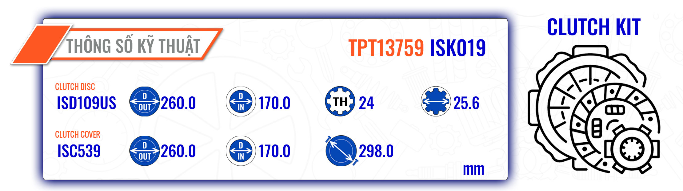 ISK020 Bộ Ly Hợp Lá Côn - Mâm Ép - BiTê (ISD109US - ISC568 - BRG502) Kích Thước [260-170-24R-25.6] Exedy - Japan